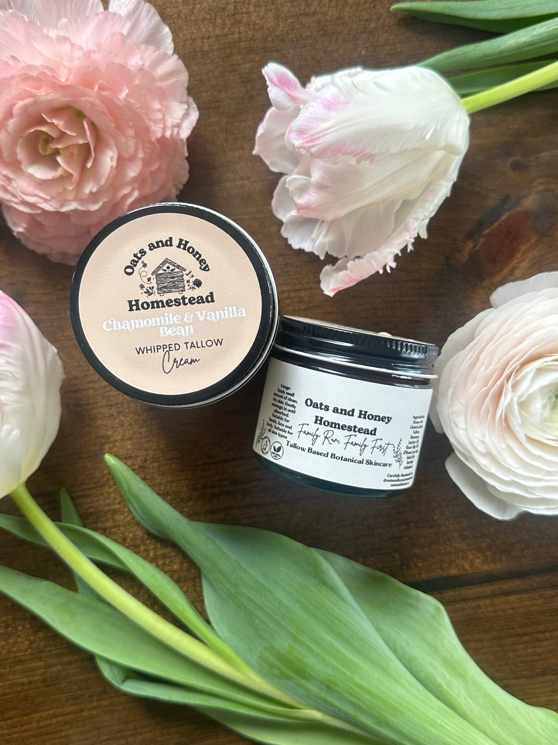 Our Chamomile and Vanilla Whipped Tallow Cream is a nourishing skincare product made from high-quality tallow, known for its numerous skin benefits. It deeply hydrates and moisturizes the skin, while promoting collagen production and improving skin elasticity. Experience the natural goodness and rejuvenating effects of our tallow-based cream